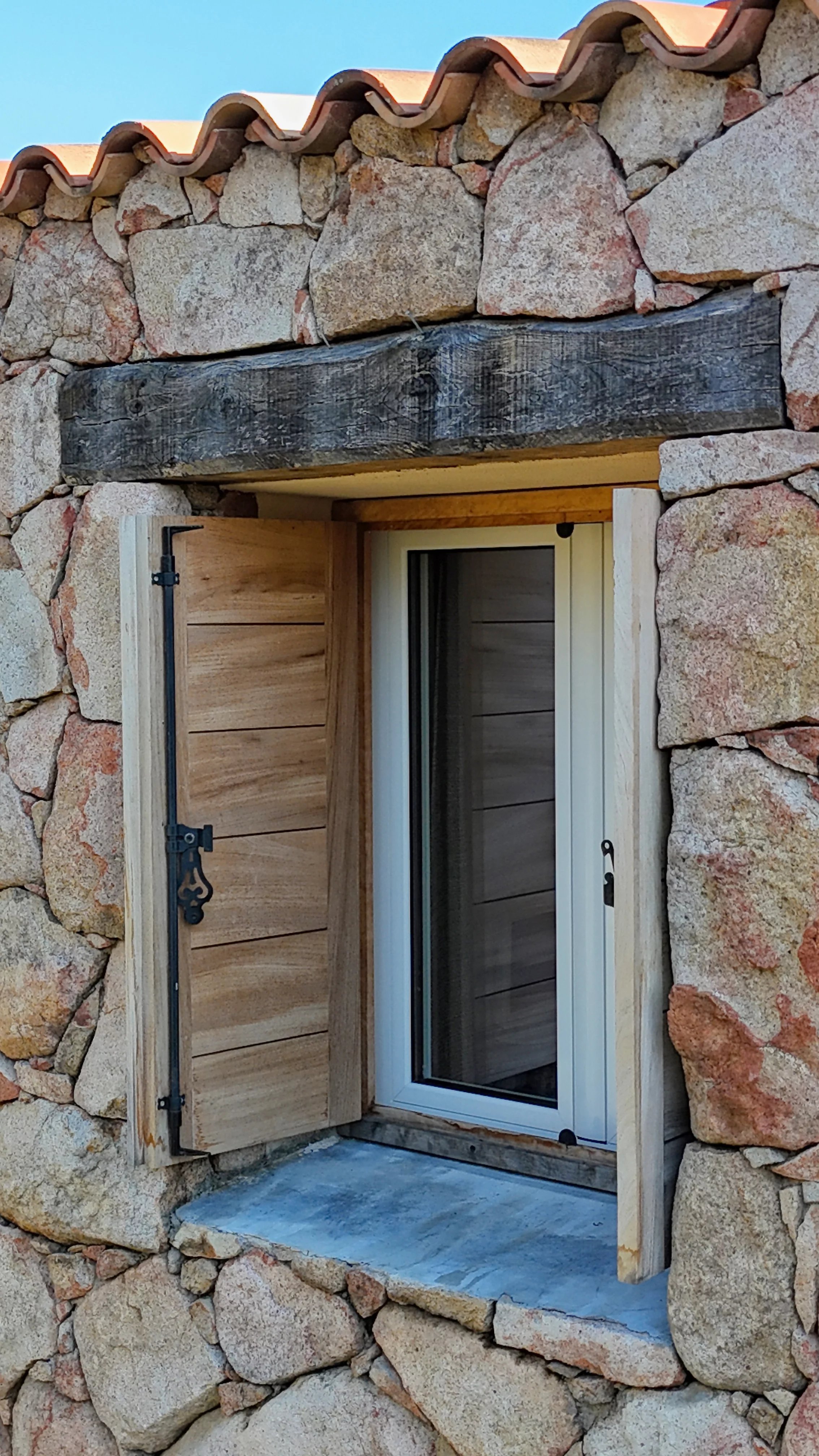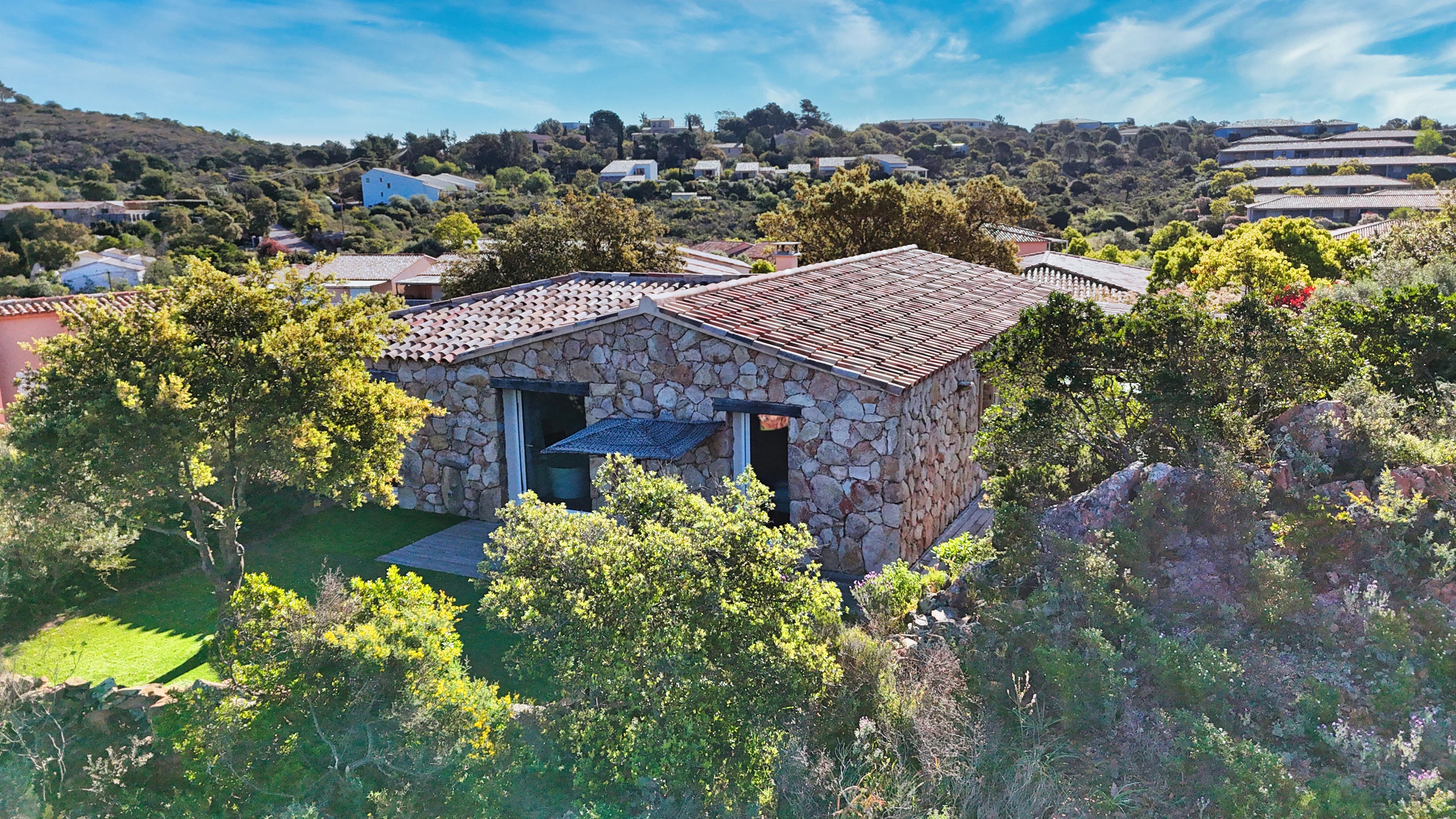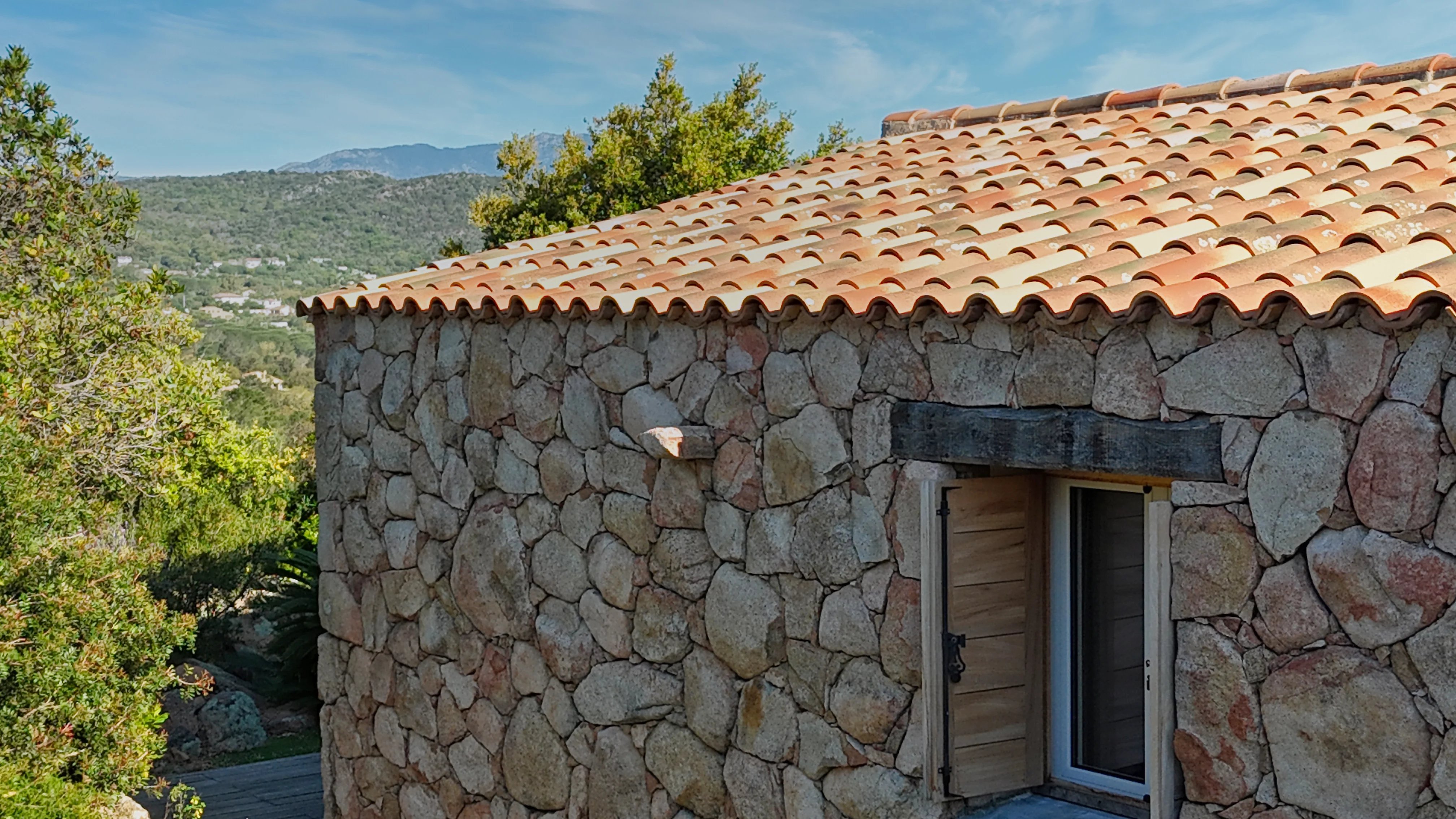 Les deux façades en pierre de la maison 'Arena' lui apportent ce cachet typiquement Corse, en parfaite harmonie avec les paysages du Sud corse.